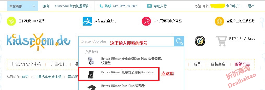 1. 这里我们以宝得适Britax Römer Duo Plus 多普勒这款儿童汽车安全座椅为例,在Kidsroom页面的搜索栏中搜索Britax Duo Plus,点击图中“Britax Römer 儿童安全座椅Duo Plus“进入产品页面